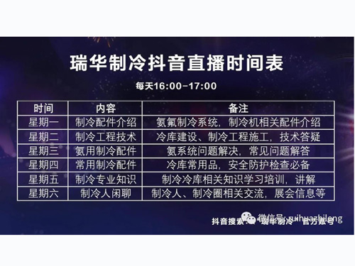 2022年瑞華制冷快速打造了直播團(tuán)隊(duì)及直播室,采購(gòu)了專業(yè)設(shè)備,為大家講解制冷知識(shí)、氨氟制冷安全、制冷工程答疑等,以后每天16:00定時(shí)開(kāi)播,每天一小時(shí),與大家共同探討制冷相關(guān)問(wèn)題,歡迎大家關(guān)注,抖音搜索“瑞華制冷”關(guān)注即可進(jìn)入直播。